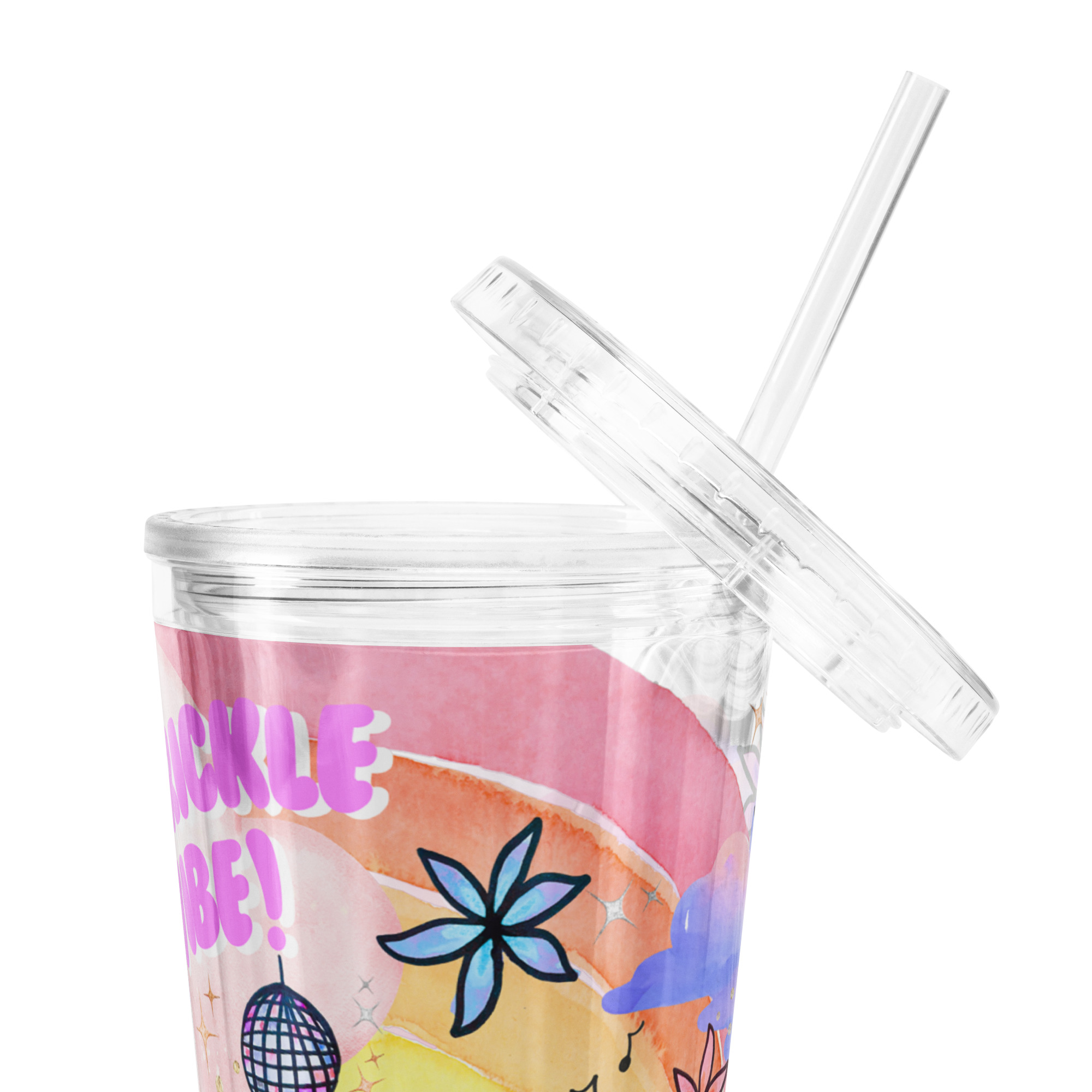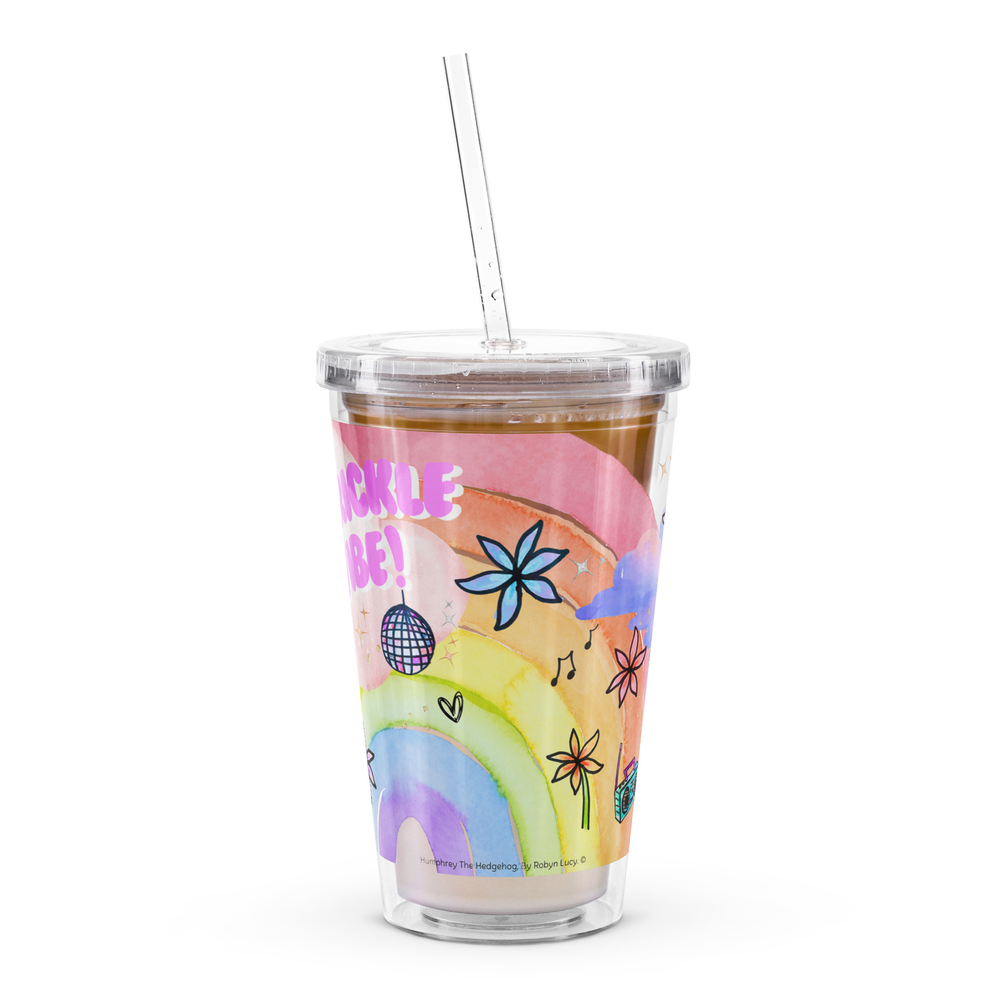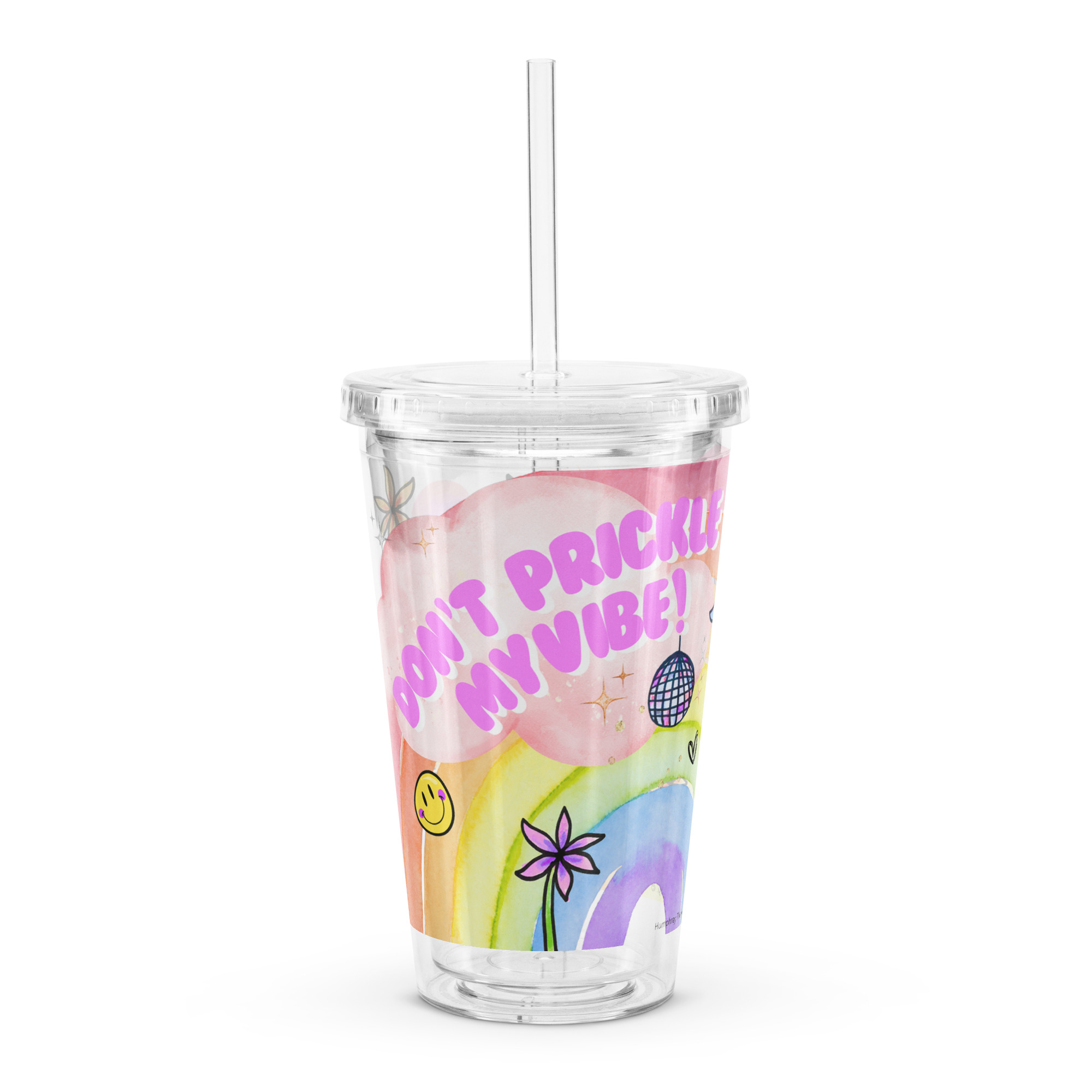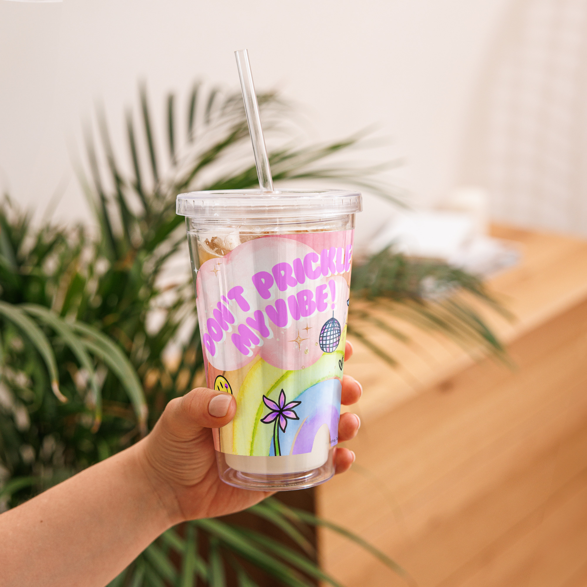 ”Don’t Prickle My Vibe” This drinks tumbler declares! Don’t let other people ruin your mood or bring you down! Enjoy feeling all sunshine, rainbows and flowers when sipping from this colourful bright cup and straw. Comes with a lid and straw for easy sipping on the move. Embrace reusability over single-use plastics without sacrificing style.